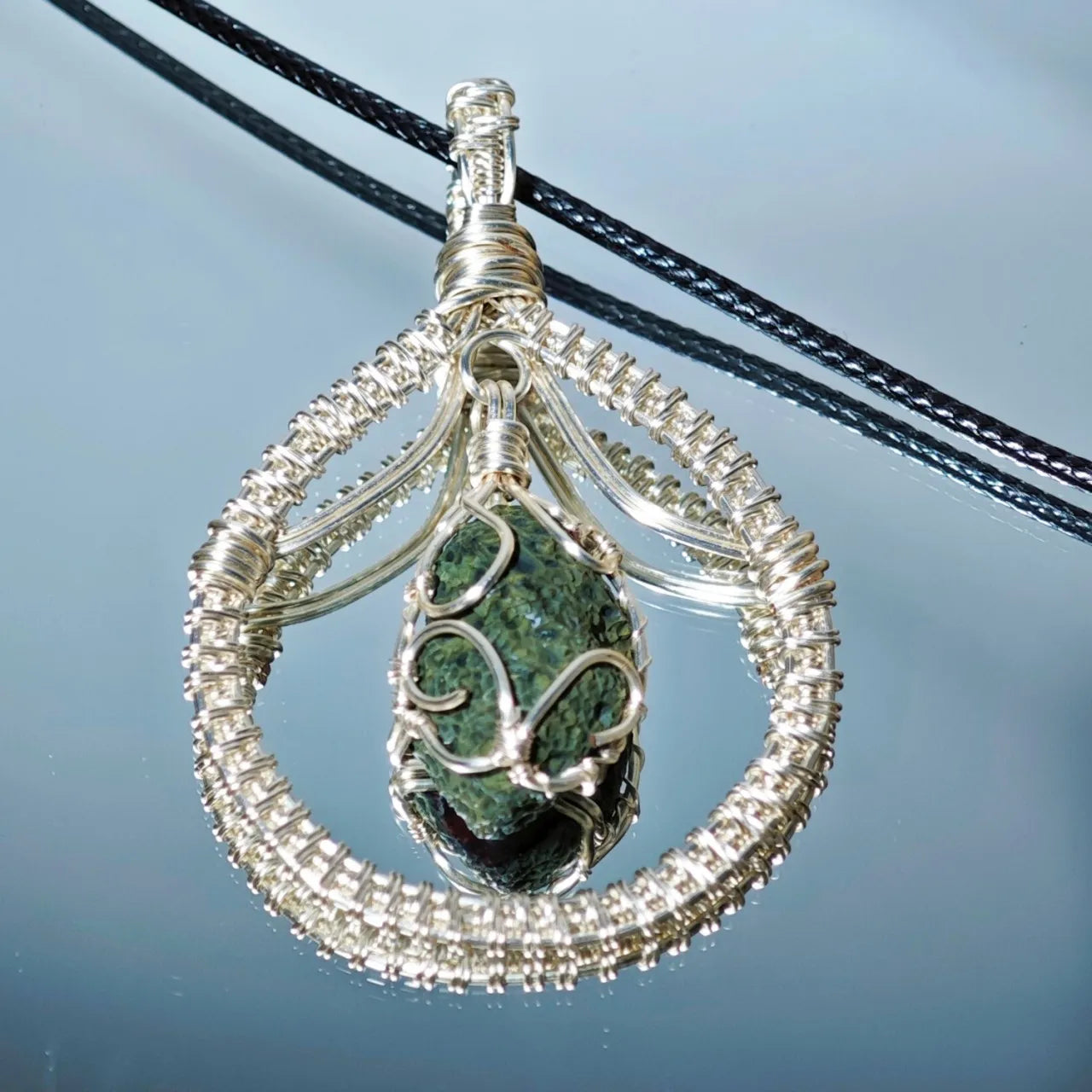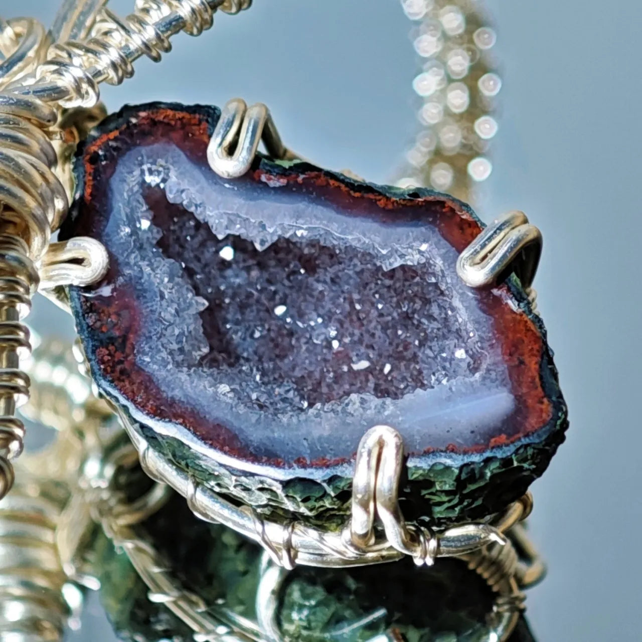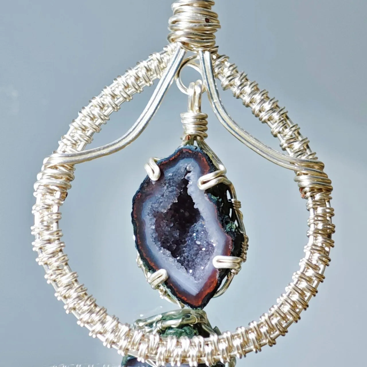 Craftsmanship: Silver wire is intricately woven around the geode, creating a delicate suspended design that blends artistry with nature.